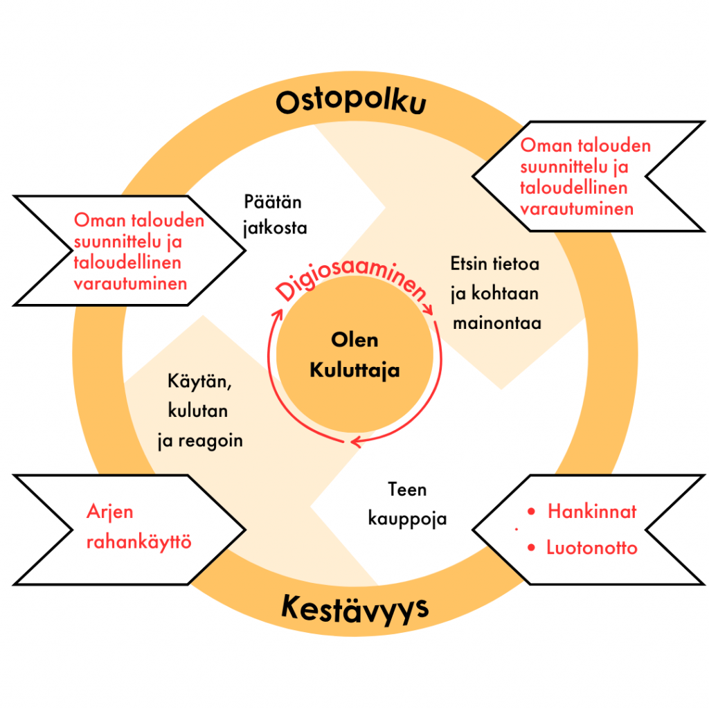 Tämän kurssin käytyäsi ja siihen sisältyvät harjoitukset suoritettuasi tulkitset helpommin talouteen liittyvää tietoa ja uutisointia. Ymmärrät paremmin omaan talouden hallintaan vaikuttavia ilmiöitä sekä voimaannut toimimaan tietoisemmin digitaalisessa kulutusympäristössä. Kurssin käytyäsi olet tietoisempi digitaalisen kulutusympäristön kuten sosiaalisen median vaikutuksista omiin valintoihisi ja talouteesi. Parhaimmillaan kurssin käytyäsi inspiroidut pohtimaan taloudellista varautumista sekä omaa taloudellista selviytymiskykyäsi elämän eri vaiheissa.